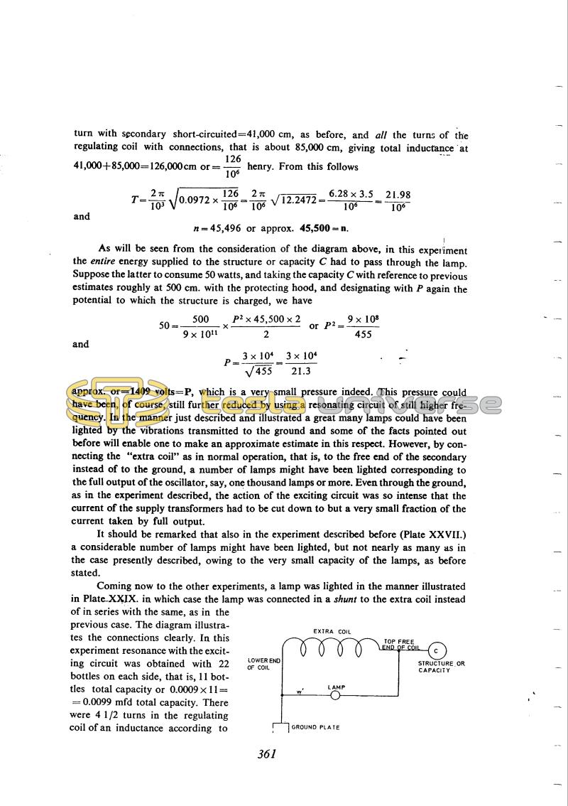 approx. or = 1409 volts = P, which is a very small pressure indeed. This pressure could have been, of course, still further reduced by using a resonating circuit of still higher frequency. In the manner just described and illustrated a great many lamps could have been lighted by the vibrations transmitted to the ground and some of the facts pointed out before will enable one to make an approximate estimate in this respect. However, by connecting the "extra coil" as in normal operation, that is, to the free end of the secondary instead of to the ground, a number of lamps might have been lighted corresponding to the full output of the oscillator, say, one thousand lamps or more. Even through the ground, as in the experiment described, the action of the exciting circuit was so intense that the current of the supply transformers had to be cut down to but a very small fraction of the current taken by full output.