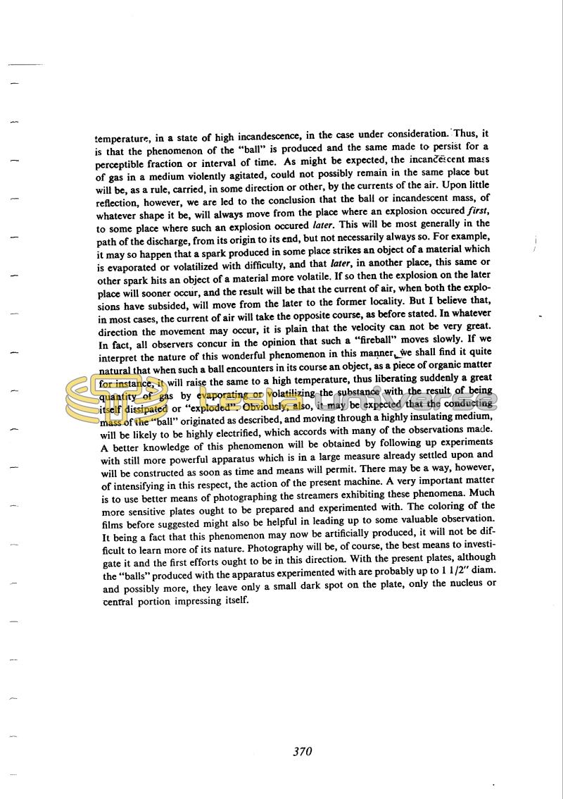 After description of several photographs showing the laboratory on photograph No. 41, he explains some current streamer transformation. He mentions the current streamer division in the vicinity of the floor, the division and repeated merging of the current streamers, the event of brighter current streamer portions (which he calls sparks), and the distraction of the spark into current streamers and "fire-balls". Particularly interesting are Tesla's observations and comment about the creation of "fire-balls", the event which interested people for a long time. Some data about "ball type" lightning have been found even on Etrurian monuments, in the works of Aristotle, Lucretia and others(63).