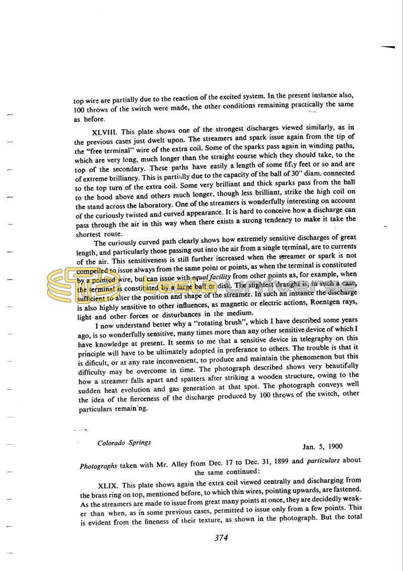 I now understand better why a "rotating brush", which I have described some years ago, is so wonderfully sensitive, many times more than any other sensitive device of which I have knowledge at present. It seems to me that a sensitive device in telegraphy on this principle will have to be ultimately adopted in preference to others. The trouble is that it is difficult, or at any rate inconvenient, to produce and maintain the phenomenon but this difficulty may be overcome in time. The photograph described shows very beautifully how a streamer falls apart and spatters after striking a wooden structure, owing to the sudden heat evolution and gas generation at that spot. The photograph conveys well the idea of the fierceness of the discharge produced by 100 throws of the switch, other particulars remaining.