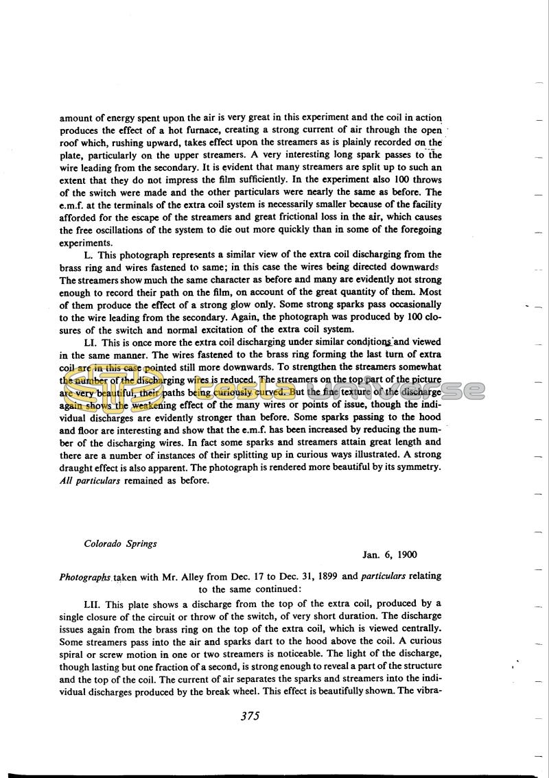 amount of energy spent upon the air is very great in this experiment and the coil in action produces the effect of a hot furnace, creating a strong current of air through the open roof which, rushing upward, takes effect upon the streamers as is plainly recorded on the plate, particularly on the upper streamers. A very interesting long spark passes to the wire leading from the secondary. It is evident that many streamers are split up to such an extent that they do not impress the film sufficiently. In the experiment also 100 throws of the switch were made and the other particulars were nearly the same as before. The e.m.f. at the terminals of the extra coil system is necessarily smaller because of the facility afforded for the escape of the streamers and great frictional loss in the air, which causes the free oscillations of the system to die out more quickly than in some of the foregoing experiments.