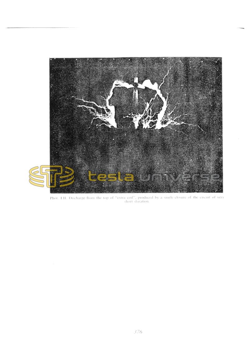 Along with comments on photograph No. 55, Tesla displayed other possible ways of producing bright spots on streamers. He assumed that along current streamers acertain kind of moving standing wave is produced which is made by means of two (or more) waves of different frequencies. He even displayed how two waves of adjacent frequencies could produce parameter variations of the oscillator constants at various operating conitions. Tesla recalls some previous experiments and does not give sufficient explanations to allow the understanding of it all.