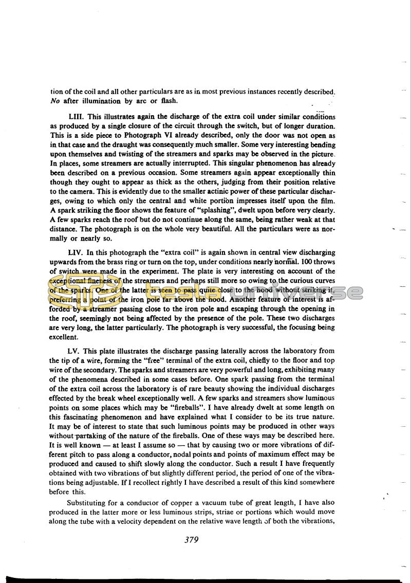 LV. This plate illustrates the discharge passing laterally across the laboratory from the tip of a wire, forming the "free" terminal of the extra coil, chiefly to the floor and top wire of the secondary. The sparks and streamers are very powerful and long, exhibiting many of the phenomena described in some cases before. One spark passing from the terminal of the extra coil across the laboratory is of rare beauty showing the individual discharges effected by the break wheel exceptionally well. A few sparks and streamers show luminous points on some places which may be "fireballs". I have already dwelt at some length on this fascinating phenomenon and have explained what I consider to be its true nature. It may be of interest to state that such luminous points may be produced in other ways without partaking of the nature of the fireballs. One of these ways may be described here. It is well known - at least I assume so - that by causing two or more vibrations of different pitch to pass along a conductor, nodal points and points of maximum effect may be produced and caused to shift slowly along the conductor. Such a result I have frequently obtained with two vibrations of but slightly different period, the period of one of the vibrations being adjustable. If I recollect rightly I have described a result of this kind somewhere before this.