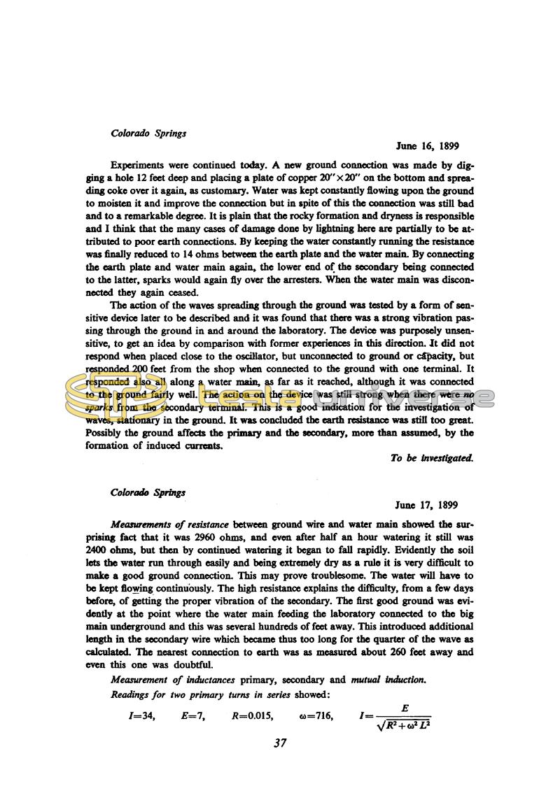 Experiments were continued today. A new ground connection was made by digging a hole 12 feet deep and placing a plate of copper 20"x20" on the bottom and spreading coke over it again, as customary. Water was kept constantly flowing upon the ground to moisten it and improve the connection but in spite of this the connection was still bad and to a remarkable degree. It is plain that the rocky formation and dryness is responsible and I think that the many cases of damage done by lightning here are partially to be attributed to poor earth connections. By keeping the water constantly running the resistance was finally reduced to 14 ohms between the earth plate and the water main. By connecting the earth plate and water main again, the lower end of the secondary being connected to the latter, sparks would again fly over the arresters. When the water main was disconnected they again ceased.