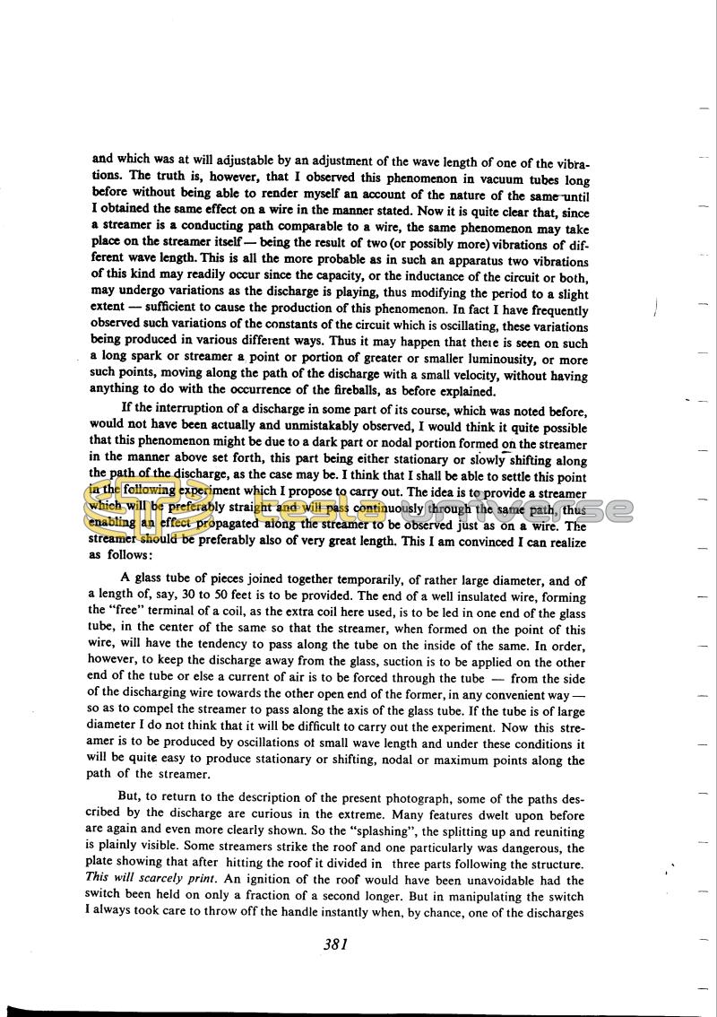 and which was at will adjustable by an adjustment of the wave length of one of the vibrations. The truth is, however, that I observed this phenomenon in vacuum tubes long before without being able to render myself an account of the nature of the same until I obtained the same effect on a wire in the manner stated. Now it is quite clear that, since a streamer is a conducting path comparable to a wire, the same phenomenon may take place on the streamer itself - being the result of two (or possibly more) vibrations of different wave length. This is all the more probable as in such an apparatus two vibrations of this kind may readily occur since the capacity, or the inductance of the circuit or both, may undergo variations as the discharge is playing, thus modifying the period to a slight extent - sufficient to cause the production of this phenomenon. In fact I have frequently observed such variations of the constants of the circuit which is oscillating, these variations being produced in various different ways. Thus it may happen that there is seen on such a long spark or streamer a point or portion of greater or smaller luminosity, or more such points, moving along the path of the discharge with a small velocity, without having anything to do with the occurrence of the fireballs, as before explained.