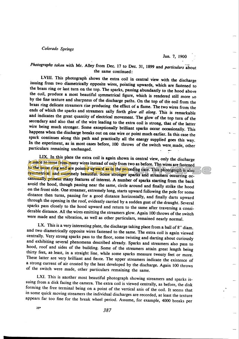 This is the last entry in the diary. Apart from the usual description of photographs, Tesla writes about experiments he intends to carry out on his return (where?). He qualifies the experiments to date as satisfactory, considering that his aim was "to perfect the apparatus and make general observations". The apparatus which he was then envisaging for future experiments was to be an improved oscillator which would enable better results than any he had so far obtained.