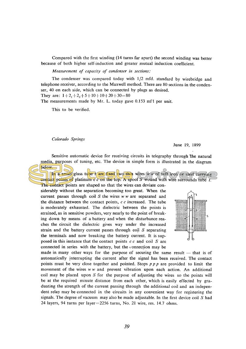 Continuing his study of the receiver components referred to between 9th and 11th June, Tesla describes a sensitive detector using the attractive force between the plates of a charged condenser. Descriptions of allied devices are to be found in several of Tesla's patents. In patents(8) and (9) this effect is used to periodically make the receiver circuit when main condenser charges up sufficiently (there is no preexcitation nor quenching, since the circuit quenches itself when all the stored energy gets discharged). A fuller description, where it is noted that the performance of the device is improved under reduced air pressure, may be found in patents(70).