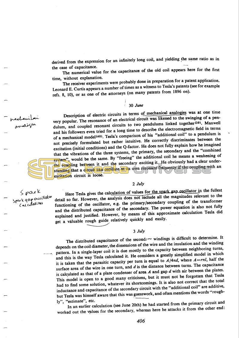 The distributed capacitance of the secondary windings is difficult to determine. It depends on the coil diameter, the dimensions of the wire and the insulation and the winding pattern. In a single-layer coil it is due mostly to the capacity between neigh boring turns, and this is the way Tesla calculated it. He considers a greatly simplified model in which it is taken that the parasitic capacity per turn is equal to A/4!$ \pi !$d, where A = r!$ \pi !$l, half the surface area of the wire in one turn, and d is the distance between turns. The capacitance is calculated as that of a plate condenser of area A and gap d with air between the plates. This model is open to a good many criticisms, but it must not be forgotten that Tesla had to find some solution, whatever its shortcomings. It is also not correct that the total inductance and capacitance of the secondary circuit with the "additional coil" are additive, but Tesla was himself aware that this was guesswork, and often mentions the words "roughly", "estimate", etc.
