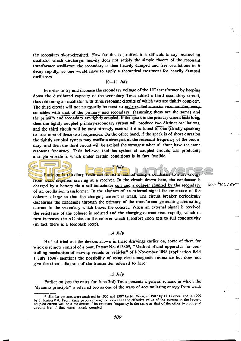 In order to try and increase the secondary voltage of the HF transformer by keeping down the distributed capacity of the secondary Tesla added a third oscillatory circuit, thus obtaining an oscillator with three resonant circuits of which two are tightly coupled*. The third circuit will not necessarily be most strongly excited when its resonant frequency coincides with that of the primary and secondary (assuming these are the same) and the primary and secondary are tightly coupled. If the spark in the primary circuit lasts long, then the tightly coupled primary-secondary system will produce two distinct oscillations, and the third circuit will be most strongly excited if it is tuned to one (strictly speaking to near one) of these two frequencies. On the other hand, if the spark is of short duration the tightly coupled system may oscillate strongest at the resonant frequency of the secondary, and then the third circuit will be excited the strongest when all three have the same resonant frequency. Tesla believed that his system of coupled circuits was producing a single vibration, which under certain conditions is in fact feasible.