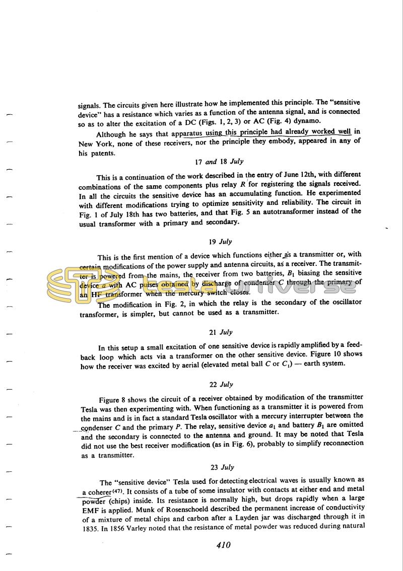The "sensitive device" Tesla used for detecting electrical waves is usually known as a coherer(47). It consists of a tube of some insulator with contacts at either end and metal powder (chips) inside. Its resistance is normally high, but drops rapidly when a large EMF is applied. Munk of Rosenschoeld described the permanent increase of conductivity of a mixture of metal chips and carbon after a Layden jar was discharged through it in 1835. In 1856 Varley noted that the resistance of metal powder was reduced during natural