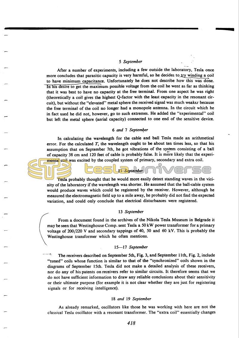In calculating the wavelength for the cable and ball Tesla made an arithmetical error. For the calculated T, the wavelength ought to be about ten times less, so that his assumption that on September 7th, he got vibrations of the system consisting of a ball of capacity 38 cm and 120 feet of cable is probably false. It is more likely that the experimental coil was excited by the coupled system of primary, secondary and extra coil.
