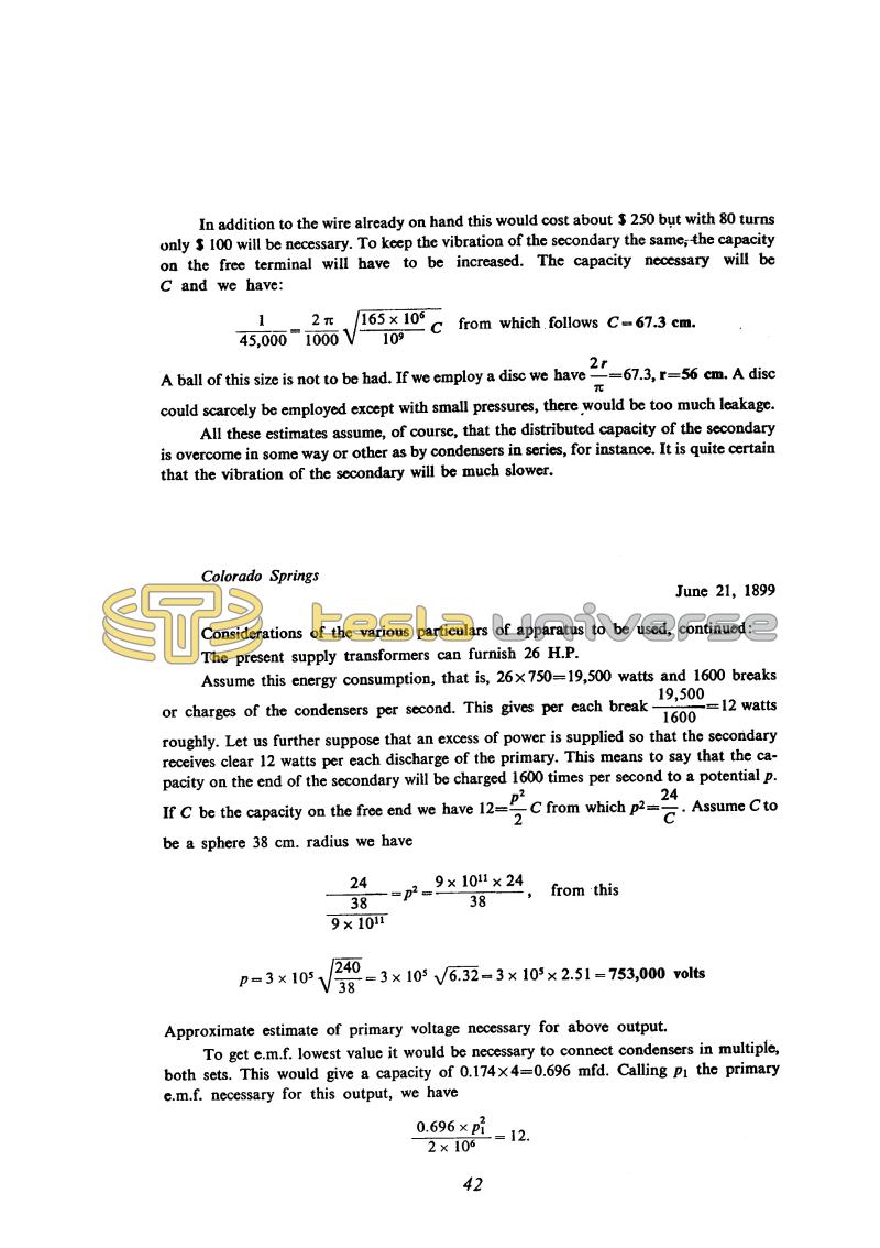 Returning back again to the question of power transfer from a supply network to high frequency power, he calculates the energy per capacitor charge impulse (please see comment of June 20). Considering that all energy of the charged capacitor in one instance exists in the capacitor in the secondary circuit, Tesla actually finds the maximum value of voltage on secondary capacitor. For linked circuits without losses the energy equation is: