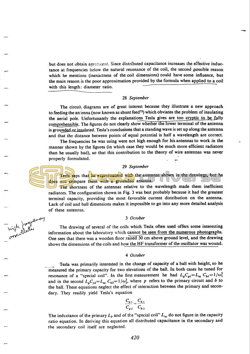 Tesla was primarily interested in the change of capacity of a ball with height, so he measured the primary capacity for two elevations of the ball. In both cases he tuned for resonance of a "special coil". In the first measurement he had Lp Cp1 = Lsc Cb1 = 1/Ï21 and in the second Lp Cp2 = Lsc Cb2 = 1/Ï22, where p refers to the primary circuit and b to the ball. These equations neglect the effect of interaction between the primary and secondary. They readily yield Tesla's equation