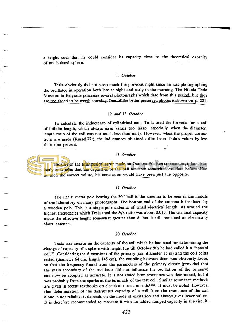 Tesla was measuring the capacity of the coil which he had used for determining the change of capacity of a sphere with height (up till October 9th he had called it a "special coil"). Considering the dimensions of the primary (coil diameter 15 m) and the coil being tested (diameter 64 cm, length 145 cm), the coupling between them was obviously loose, so that the frequency found from the parameters of the primary circuit (provided that the main secondary of the oscillator did not influence the oscillation of the primary) can now be accepted as accurate. It is not stated how resonance was determined, but it was probably from the sparks at the terminals of the test coil. Similar resonance methods are given in recent textbooks on electrical measurements(56). It must be noted, however, that determination of the distributed capacity of a coil from the resonance of the coil alone is not reliable, it depends on the mode of excitation and always gives lower values. It is therefore recommended to measure it with an added lumped capacity in the circuit.
