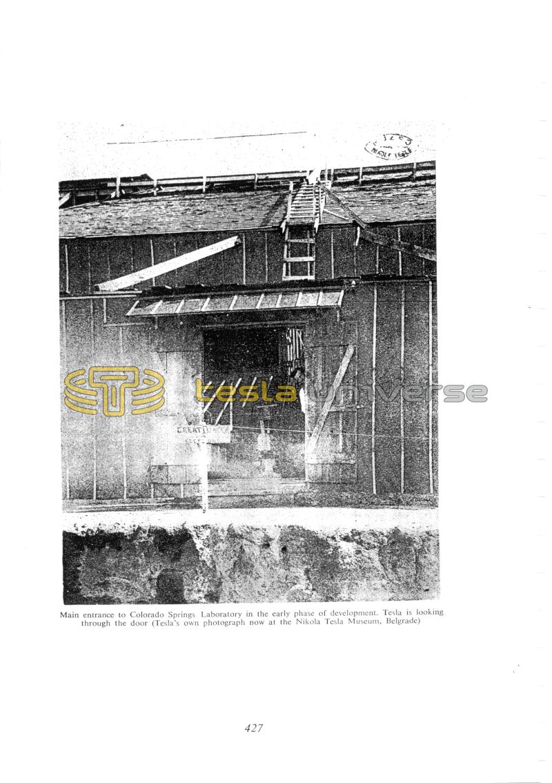 Main entrance to Colorado Springs Laboratory in the early phase of development. Tesla is looking through the door (Tesla's own photograph now at the Nikola Tesla Museum, Belgrade)