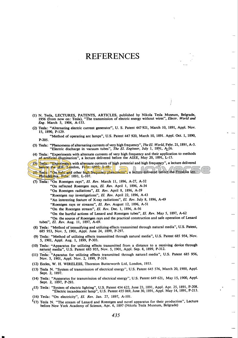 N. Tesla, LECTURES, PATENTS, ARTICLES, published by Nikola Tesla Museum, Belgrade, 1956 (from now on: Tesla), "The transmission of electric energy without wires", Electr. World and Eng. March 5, 1904, A-153.