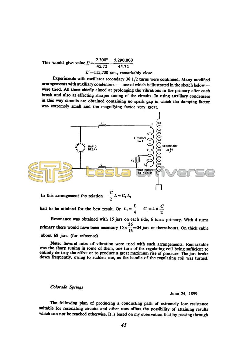 For the purpose of primary circuit resonant frequency adjustment he uses the variable inductance*. The value of this inductance he determines by calculation, by means of an equation for an infinitely long coil and another equation which he calls Langevine equation. Actually, these two equations are identical if wire thickness is neglected because then
