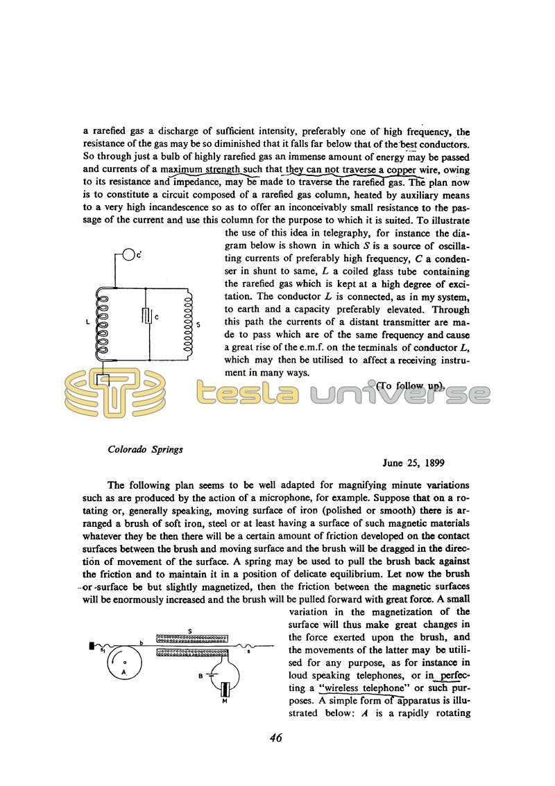 Rarefied gases had long interested Tesla, and his work on their conducting properties, especially at high frequencies, is well known, e.g. the patents on an electric lighting system and an incandescent lamp(37). He presented detailed analyses of the same problems in his famous lectures(4, 5, 6). Rarefied gas as a conductor is also referred to in his patent application "System of transmission of electrical energy"(13).
