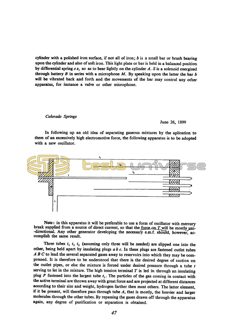 The principle of this device using high voltages to separate gases would be that the molecules (in fact ions) of the different gases would behave differently because of their different mass: charge ratios. It is not known whether Tesla tried to verify this idea experimentally. In a later article(28) on electrical oscillators he mentions among the possible applications "formation of chemical compounds through fusion and combination; synthesis of gases; manufacture of ozone ..." but does not mention separation of gases, so that it may be he never went any further than the initial idea.