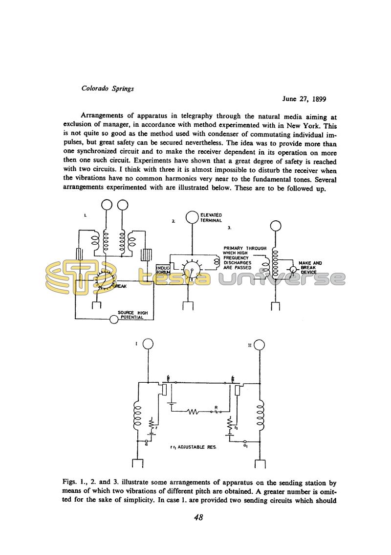 The circuit of transmitter (Figure No. 1 and 2) and receiver (Figure No. 3) with more than one resonant circuit so that transmitter produces two or more signals of different frequencies, and the receiver reacts when all these signals act simultaneously, are patented in two patents submitted on July 16, 1900(38).