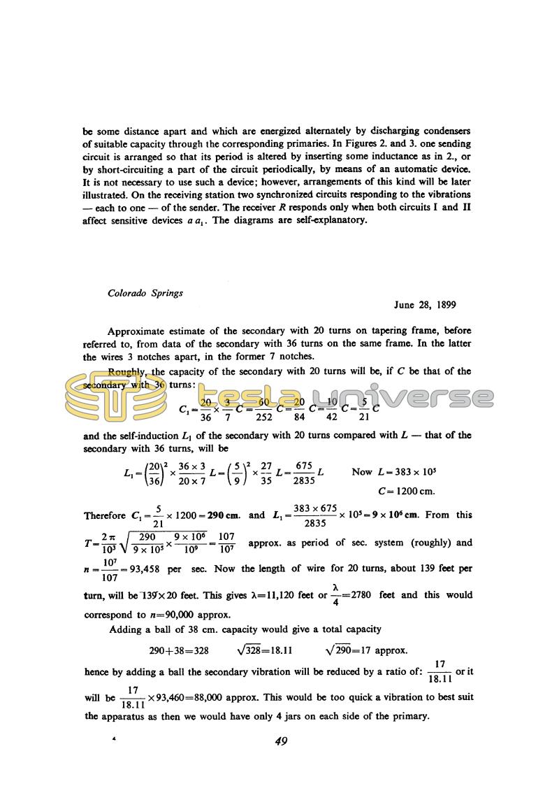Numerical data for old coil distributed capacitance appears here for the first time without any explanation. With calculated distributed capacitance and inductance for new coil, Tesla determines the oscillation period for the new secondary. This period (or its reciprocal value - frequency) compares with value obtained on the basis of the condition that wirelength in the secondary coil is equal to quarter of a wavelength. Then he adds the sphere capacitance to secondary and determines the reduction of resonant frequency. He concludes that vibration is high, because then small capacitance in primary circuit is required. In that case the source does not have to operate at full power. At the end, in series with the secondary he adds "additional coil", adds together all capacitances (obviously incorrectly) and by not taking into account the inductance of "additional coil", he determines the change of secondary resonant frequency.