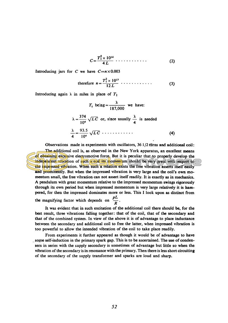 The additional coil is, as observed in the New York apparatus, an excellent means of obtaining excessive electromotive force. But it is peculiar that to properly develop the independent vibration of such a coil its momentum should be very great with respect to the impressed vibration. When such a relation exists the free vibration asserts itself easily and prominently. But when the impressed vibration is very large and the coil's own momentum small, the free vibration can not assert itself readily. It is exactly as in mechanics. A pendulum with great momentum relative to the impressed momentum swings rigorously through its own period but when impressed momentum is very large relatively it is hampered, for then the impressed dominates more or less. This I look upon as distinct from the magnifying factor which depends on !$ {pL \over R} !$.