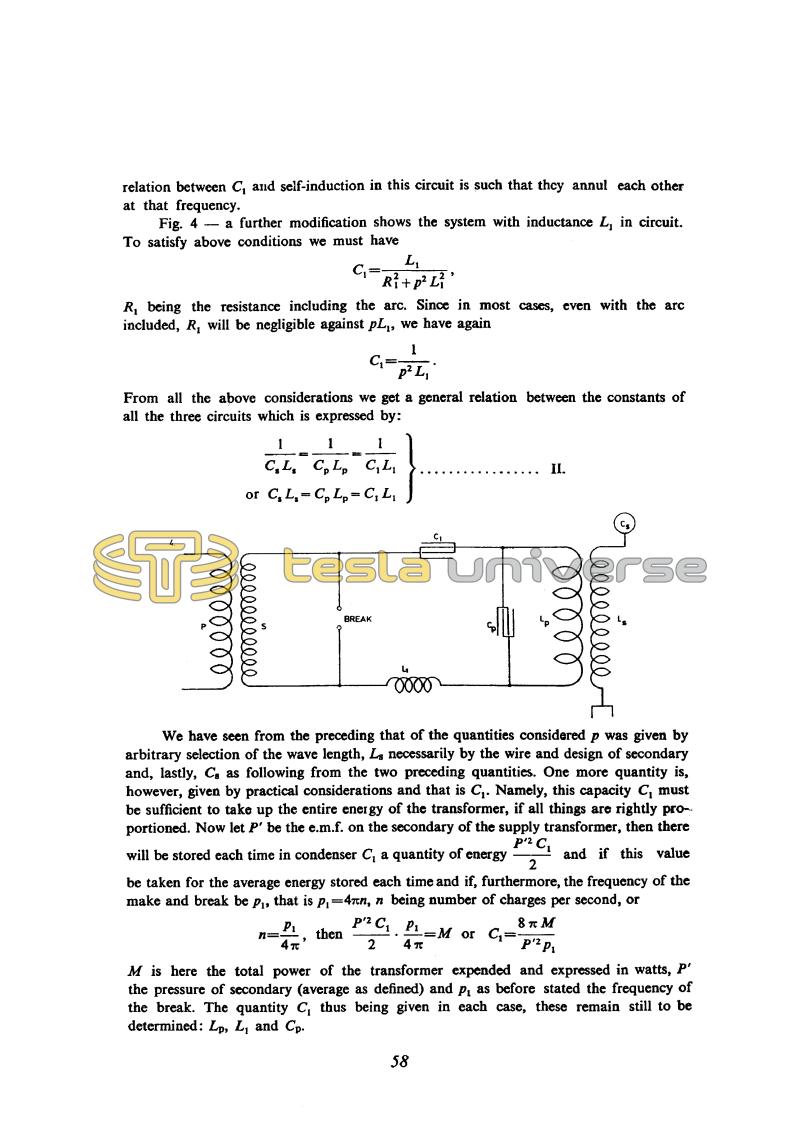 We have seen from the preceding that of the quantities considered p was given by arbitrary selection of the wave length, Ls necessarily by the wire and design of secondary and, lastly, Cs as following from the two preceding quantities. One more quantity is, however, given by practical considerations and that is C1. Namely, this capacity C1 must be sufficient to take up the entire energy of the transformer, if all things are rightly proportioned. Now let P' be the e.m.f. on the secondary of the supply transformer, then there will be stored each time in condenser C1 a quantity of energy !$ {P'^{2} C_{1} \over 2} !$ and if this value be taken for the average energy stored each time and if, furthermore, the frequency of the make and break be p1, that is p1 = 4â¼n, n being number of charges per second, or