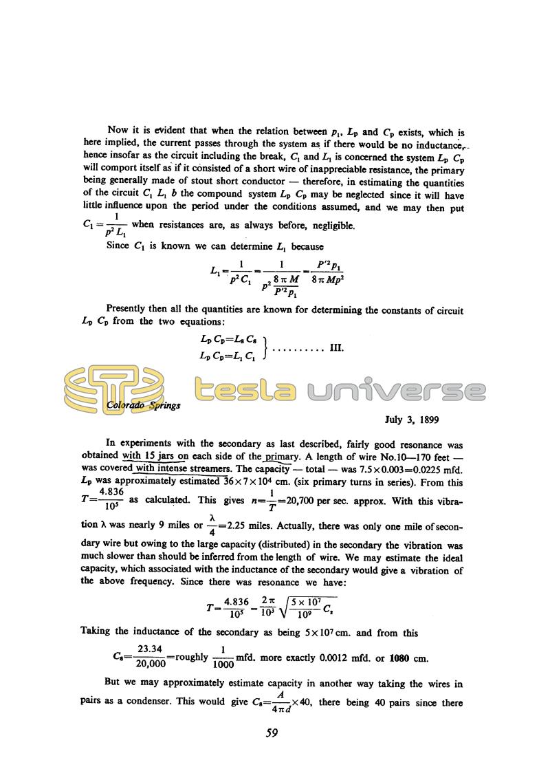 In experiments with the secondary as last described, fairly good resonance was obtained with 15 jars on each side of the primary. A length of wire No. 10 - 170 feet - was covered with intense streamers. The capacity - total - was 7.5x0.003=0.0225 mfd. Lp was approximately estimated 36x7x104 cm. (six primary turns in series). From this T = !$ {4.836 \over 10^{5}} !$ as calculated. This gives n = !$ {1 \over T} !$ = 20,7000 per sec. approx. With this vibration λ was nearly 9 miles or !$ {λ \over 4} !$ = 2.25 miles. Actually, there was only one mile of secondary wire but owing to the large capacity (distributed) in the secondary the vibration was much slower than should be inferred from the length of wire. We may estimate the ideal capacity, which associated with the inductance of the secondary would give a vibration of the above frequency. Since there was resonance we have: