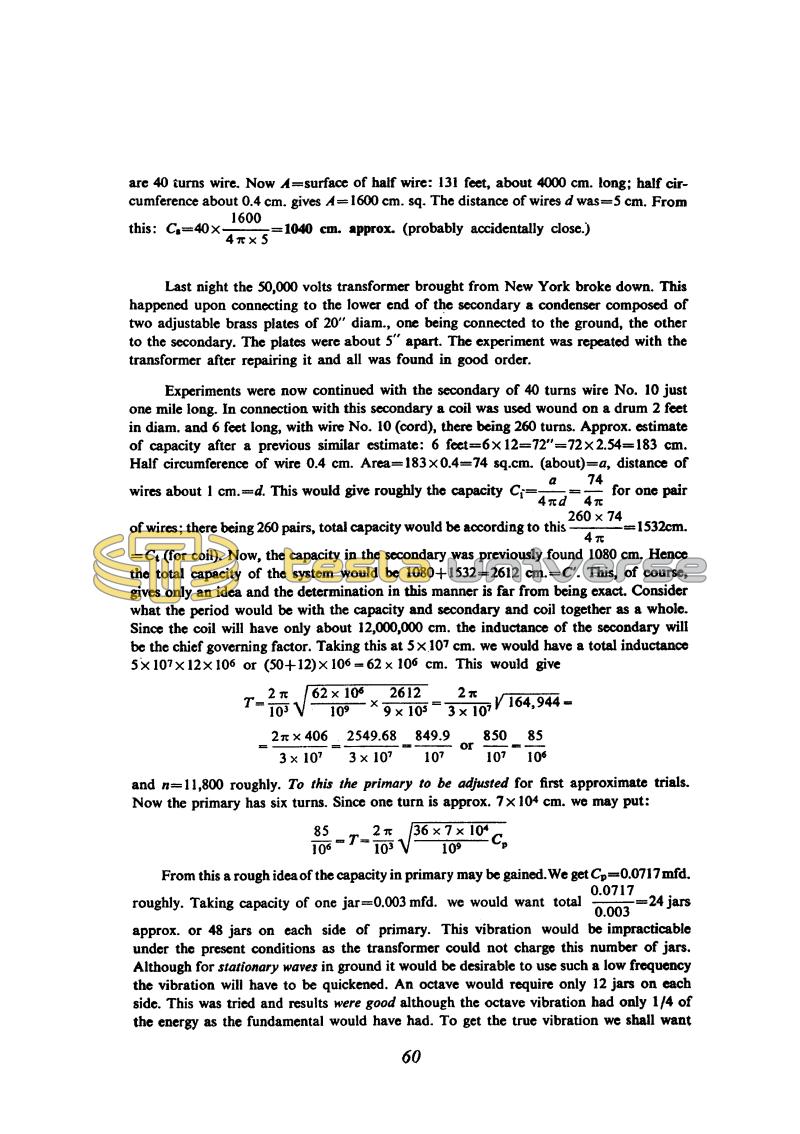 Experiments were now continued with the secondary of 40 turns wire No. 10 just one mile long. In connection with this secondary a coil was used wound on a drum 2 feet in diam. and 6 feet long, with wire No. 10 (cord), there being 260 turns. Approx. estimate of capacity after a previous similar estimate: 6 feet = 6 x 12 = 72" = 72 x 2.54 = 183 cm. Half circumference of wire 0.4 cm. Area = 183 x 0.4 = 74 sq. cm. (about) = a, distance of wires about 1 cm. =d. This would give roughly the capacity C1 = !$ {a \over {4 \pi d}} !$ = !$ {74 \over {4 \pi}} !$ for one pair of wires; there being 260 pairs, total capacity would be according to this !$ {{260 \times 74} \over {4 \pi}} !$ = 1532cm. = Ct (for coil). Now, the capacity in the secondary was previously found 1080 cm. Hence the total capacity of the system would be 1080 + 1532 = 2612 cm. = C'. This, of course, gives only an idea and the determination in this manner is far from being exact. Consider what the period would be with the capacity and secondary and coil together as a whole. Since the coil will have only about 12,000,000 cm. the inductance of the secondary will be the chief governing factor. Taking this at 5 x 107 cm. we would have a total inductance 5 x 107 x 12 x 106 or (50 + 12) x 106 = 62 x 106 cm. This would give