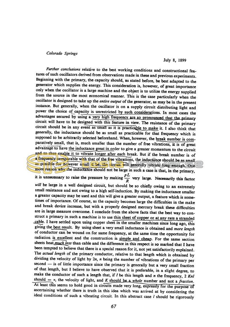 Detailed consideration of high frequency transformer is actually a resume of obtained experiences and theoretical thoughts. In order to achieve the goal - the machine of higher power and voltage, Tesla looks for methods to optimize all oscillator details; arcing device, primary and secondary inductances, mutual inductance and distributed secondary capacitance. In the analysis he makes the distinction between the device which would be used for high power transmission at a distance, and that one where small power is required as e.g., for transmission of messages. For the first type a high frequency transformer would be made in a similar way as for low frequencies (therefore with a strong link), and for the other type, high secondary voltage would be achieved by the use of over voltage on the secondary circuit which is poorly linked with primary circuits. In the latter case a maximum validity factor pL/R is required and minimal secondary capacitance.