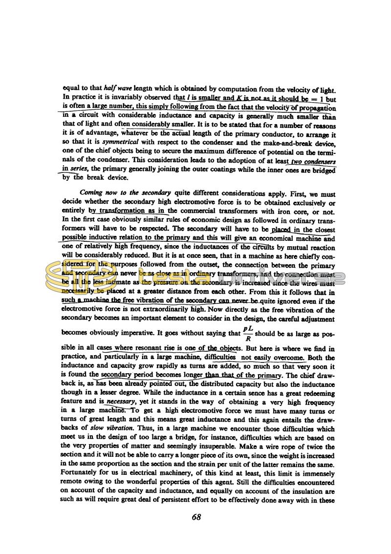 Detailed consideration of high frequency transformer is actually a resume of obtained experiences and theoretical thoughts. In order to achieve the goal - the machine of higher power and voltage, Tesla looks for methods to optimize all oscillator details; arcing device, primary and secondary inductances, mutual inductance and distributed secondary capacitance. In the analysis he makes the distinction between the device which would be used for high power transmission at a distance, and that one where small power is required as e.g., for transmission of messages. For the first type a high frequency transformer would be made in a similar way as for low frequencies (therefore with a strong link), and for the other type, high secondary voltage would be achieved by the use of over voltage on the secondary circuit which is poorly linked with primary circuits. In the latter case a maximum validity factor pL/R is required and minimal secondary capacitance.