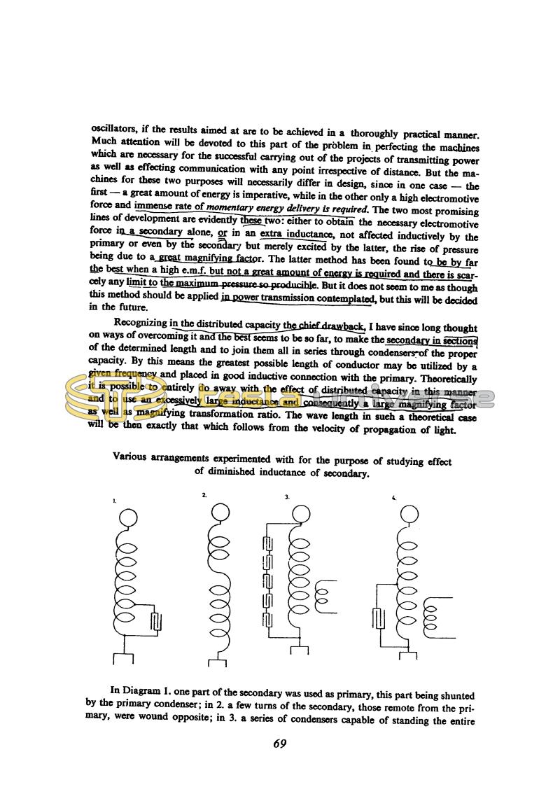 oscillators, if the results aimed at are to be achieved in a thoroughly practical manner. Much attention will be devoted to this part of the problem in perfecting the machines which are necessary for the successful carrying out of the projects of transmitting power as well as effecting communication with any point irrespective of distance. But the machines for these two purposes will necessarily differ in design, since in one case - the first - a great amount of energy is imperative, while in the other only a high electromotive force and immense rate of momentary energy delivery is required. The two most promising lines of development are evidently these two: either to obtain the necessary electromotive force in a secondary alone, or in an extra inductance, not affected inductively by the primary or even by the secondary but merely excited by the latter, the rise of pressure being due to a great magnifying factor. The latter method has been found to be by far the best when a high e.m.f. but not a great amount of energy is required and there is scarcely any limit to the maximum pressure so producible. But it does not seem to me as though this method should be applied in power transmission contemplated, but this will be decided in the future.