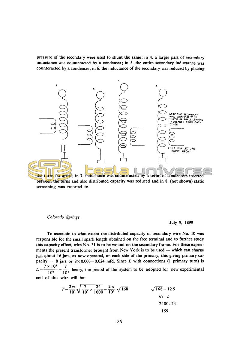 In the calculations method of determining the oscillation period, Tesla applies two equations: one in which he neglects the secondary influence (as e.g., the beginning of note July 9) and the other, when he takes into account the secondary influence. In the latter case he considers that the primary inductance is reduced by a ratio 1 - M2/NL, which corresponds to a primary inductance reduction when the secondary is short circuited. How much of this is correct, it is difficult to estimate, because the oscillator with intensive discharge does not follow the simple theory of an oscillator with a resonant transformer. Secondary circuit is then considerably damped, and free oscillations in secondary quickly disappear, and therefore it would be necessary to apply a theory which takes into account oscillations of a high damped level.
