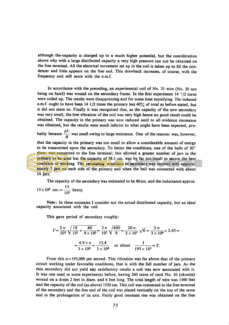 By adjusting the capacitance in the primary and secondary circuits, he achieves the maximum secondary voltage. How well Tesla knows the physics of the process could be based on the fact that he doesn't lose sight of the influence of the secondary validity factor, and the magnitude of the primary capacitance which determines the amount of power which the source could provide to the oscillator for conversion into high frequency current.