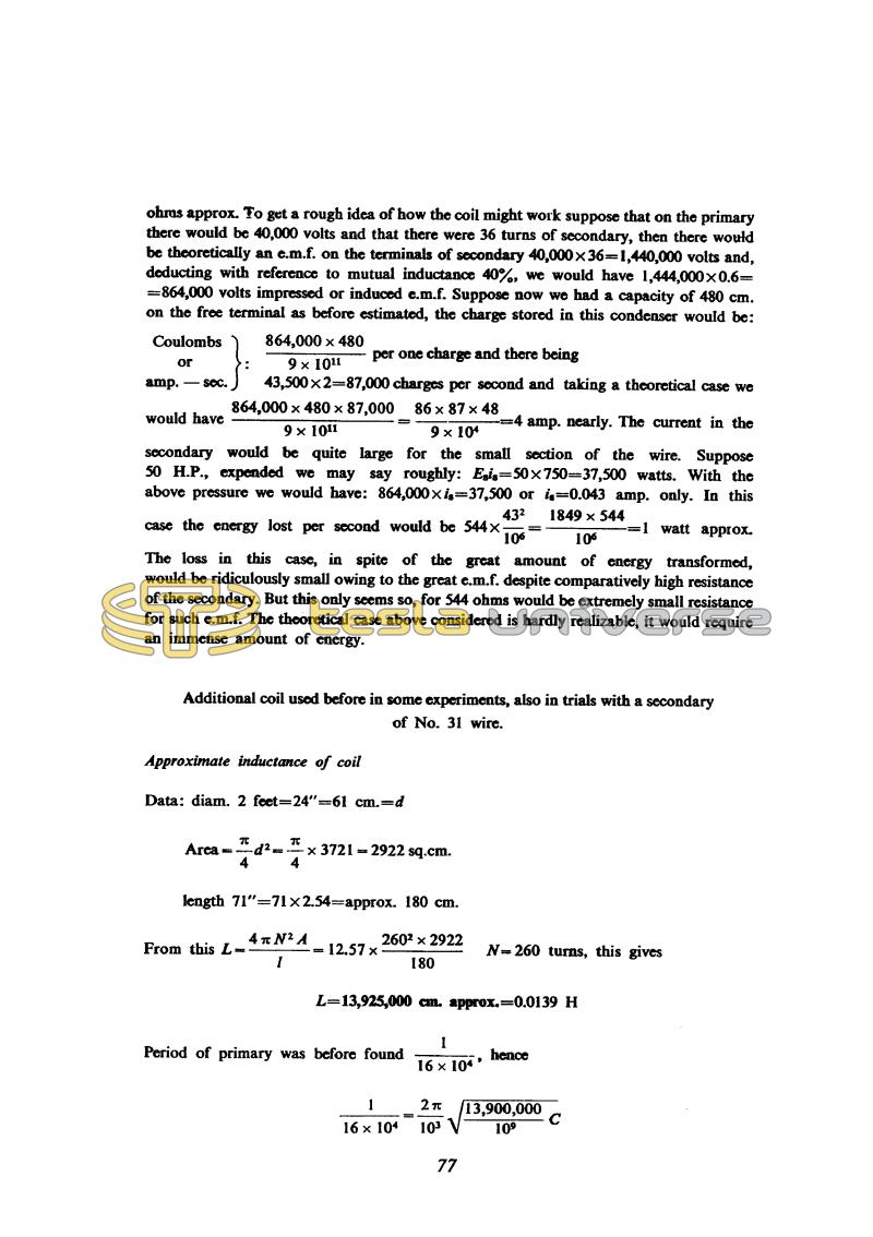 ohms approx. To get a rough idea of how the coil might work suppose that on the primary there would be 40,000 volts and that there were 36 turns of secondary, then there would be theoretically an e.m.f. on the terminals of secondary 40,000 x 36 = 1,440,000 volts and, deducting with reference to mutual inductance 40%, we would have 1,444,000 x 0.6 = 864,000 volts impressed or induced e.m.f. Suppose now we had a capacity of 480 cm. on the free terminal as before estimated, the charge stored in this condenser would be: Coulombs or amp. - sec. }: !$ {{864,000 \times 480} \over {9 \times 10^{11}}} !$ per one charge and there being 43,500 x 2 = 87,000 charges per second and taking a theoretical case we would have !$ {{864,000 \times 480 \times 87,000} \over {9 \times 10^{11}}} !$ = !$ {{86 \times 87 \times 48} \over {9 \times 10^{4}}} !$ = 4 amp. nearly. The current in the secondary would be quite large for the small section of the wire. Suppose 50 H.P., expended we may say roughly: Esis= 50 x 750 = 37,500 watts. With the above pressure we would have: 864,000 x is = 37,500 or is = 0.043 amp. only. In this case the energy lost per second would be !$ {544 \times {43^{2} \over 10^{6}}} !$ = !$ {{1849 \times 544} \over 10^{6}} !$ = 1 watt approx. The loss in this case, in spite of the great amount of energy transformed, would be ridiculously small owing to the great e.m.f. despite comparatively high resistance of the secondary. But this only seems so, for 544 ohms would be extremely small resistance for such e.m.f. The theoretical case above considered is hardly realizable, it would require an immense amount of energy.
