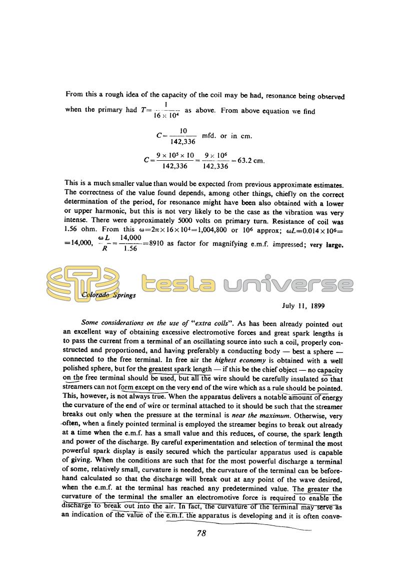 The additional coil description is very detailed. Tesla's wealthy experience in coil design is obvious in its full extent. At the end of his considerations he gives the equation for determination of the number of turns for the additional coil on the basis of operation frequency, wire diameter, separation of windings, and a constant which he determines on the basis of experimental results. He checks the equation on one example and obtains a result very close to the experimental results.