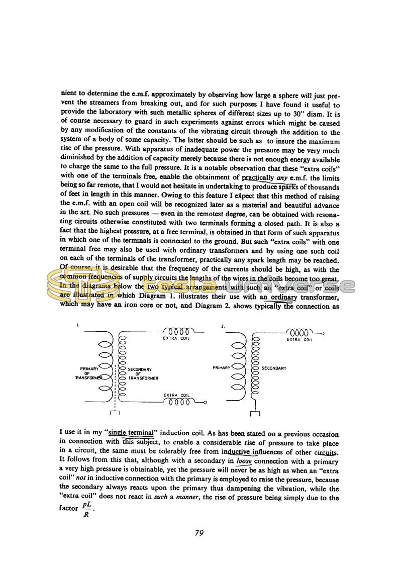 The additional coil description is very detailed. Tesla's wealthy experience in coil design is obvious in its full extent. At the end of his considerations he gives the equation for determination of the number of turns for the additional coil on the basis of operation frequency, wire diameter, separation of windings, and a constant which he determines on the basis of experimental results. He checks the equation on one example and obtains a result very close to the experimental results.