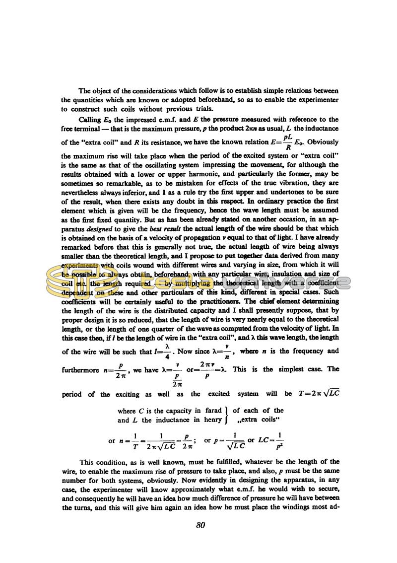 Calling Eo the impressed e.m.f. and E the pressure measured with reference to the free terminal - that is the maximum pressure, p the product 2â¼n as usual, L the inductance of the "extra coil" and R its resistance, we have the known relation E = !$ {{pL \over R} E_{o-}} !$. Obviously the maximum rise will take place when the period of the excited system or "extra coil" is the same as that of the oscillating system impressing the movement, for although the results obtained with a lower or upper harmonic, and particularly the former, may be sometimes so remarkable, as to be mistaken for effects of the true vibration, they are nevertheless always inferior, and I as a rule try the first upper and undertones to be sure of the result, when there exists any doubt in this respect. In ordinary practice the first element which is given will be the frequency, hence the wave length must be assumed as the first fixed quantity. But as has been already stated on another occasion, in an apparatus designed to give the best result the actual length of the wire should be that which is obtained on the basis of a velocity of propagation v equal to that of light. I have already remarked before that this is generally not true, the actual length of wire being always smaller than the theoretical length, and I propose to put together data derived from many experiments with coils wound with different wires and varying in size, from which it will be possible to always obtain, beforehand, with any particular wire, insulation and size of coil etc. the length required - by multiplying the theoretical length with a coefficient dependent on these and other particulars of this kind, different in special cases. Such coefficients will be certainly useful to the practitioners. The chief element determining the length of the wire is the distributed capacity and I shall presently suppose, that by proper design it is so reduced, that the length of wire is very nearly equal to the theoretical length, or the length of one quarter of the wave as computed from the velocity of light. In this case then, if l be the length of wire in the "extra coil", and λ this wave length, the length of the wire will be such that l = !$ {λ \over 4} !$. Now since λ = !$ {v \over n} !$, where n is the frequency and furthermore n = !$ {p \over {2 \pi}} !$, we have λ = !$ {v \over {p \over 2 \pi}} !$ or = !$ {{2 \pi v} \over p} !$ = λ. This is the simplest case. The period of the exciting as well as the excited system will be T = !$ {2 \pi \sqrt{LC}} !$