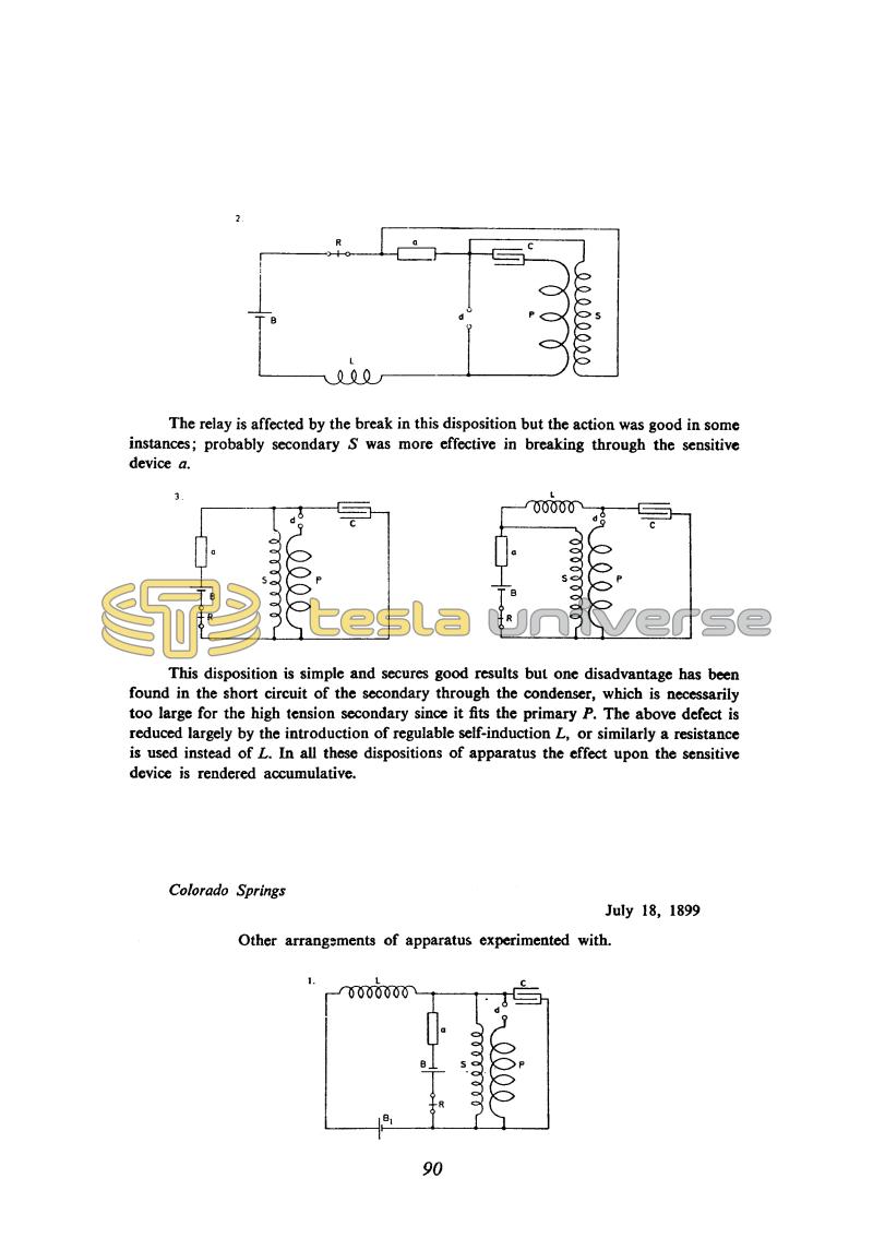 This disposition is simple and secures good results but one disadvantage has been found in the short circuit of the secondary through the condenser, which is necessarily too large for the high tension secondary since it fits the primary P. The above defect is reduced largely by the introduction of regulable self-induction L, or similarly a resistance is used instead of L. In all these dispositions of apparatus the effect upon the sensitive device is rendered accumulative.