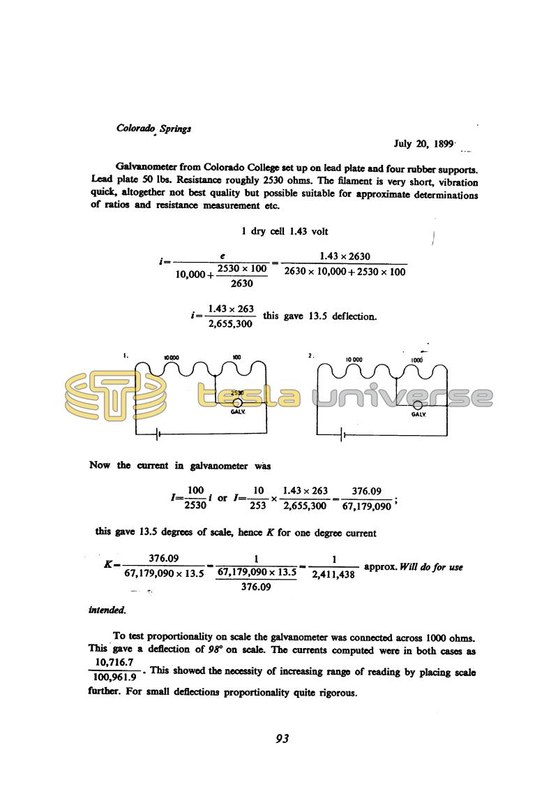 For the instrument (galvanometer) which he obtained from Colorado College he determines the sensitivity constant in amperes per deflection step and checks the scale linearity. He assumes that the battery is source of known and continuous electromotive force of 1.43 V with negligible inner resistance.