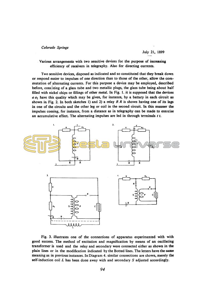 In continuation of work on receivers for continuous high frequency currents, he widens the researches on assemblies with two sensitive devices. He lays the sensitive devices out so that they are sensitive to impulses of one direction, which enables the alternating current commutation. On Fig. 1 and 2, relay coils are connected, so that the actions through both sensitive devices are added together. For other connections a small excitation of the sensitive device is quickly amplified, due to the action of the return link, which acts via the transformer. In Fig. 10, it can be seen how the receiver is excited by means of antenna systems (elevated metal sphere C or C1) - ground.