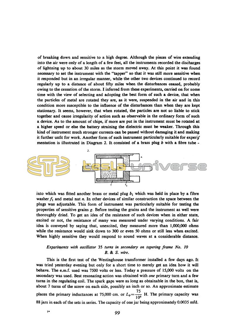 The experiments with the oscillator. In the meantime, starting from July 16, Tesla was preparing new experiments with the transmitter. lle started the testing the day before and continued on June 23. Oscillator adjustment consists of a capacitance choice in the primary circuit, and variation of regulating coil inductance which is the portion of inductance which is the portion of inductance in the primary. The oscillation period is determined from the inductance and capacitance of the primary circuit, "without taking in account the secondary reaction", and that will be approximately accurate in the extraordinary case we have discussed previously.