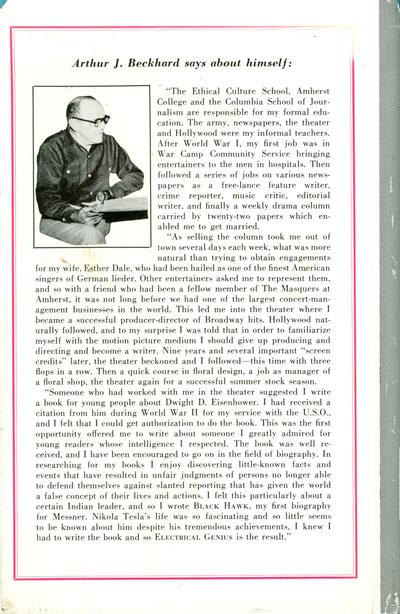Tesla's life was strange, spectacular, deeply dramatic. Mr. Beckhard has revealed not only the outer conflicts of the scientist, but the inner turmoil of the man who, leashing his own impulses, released the miracles of electricity.