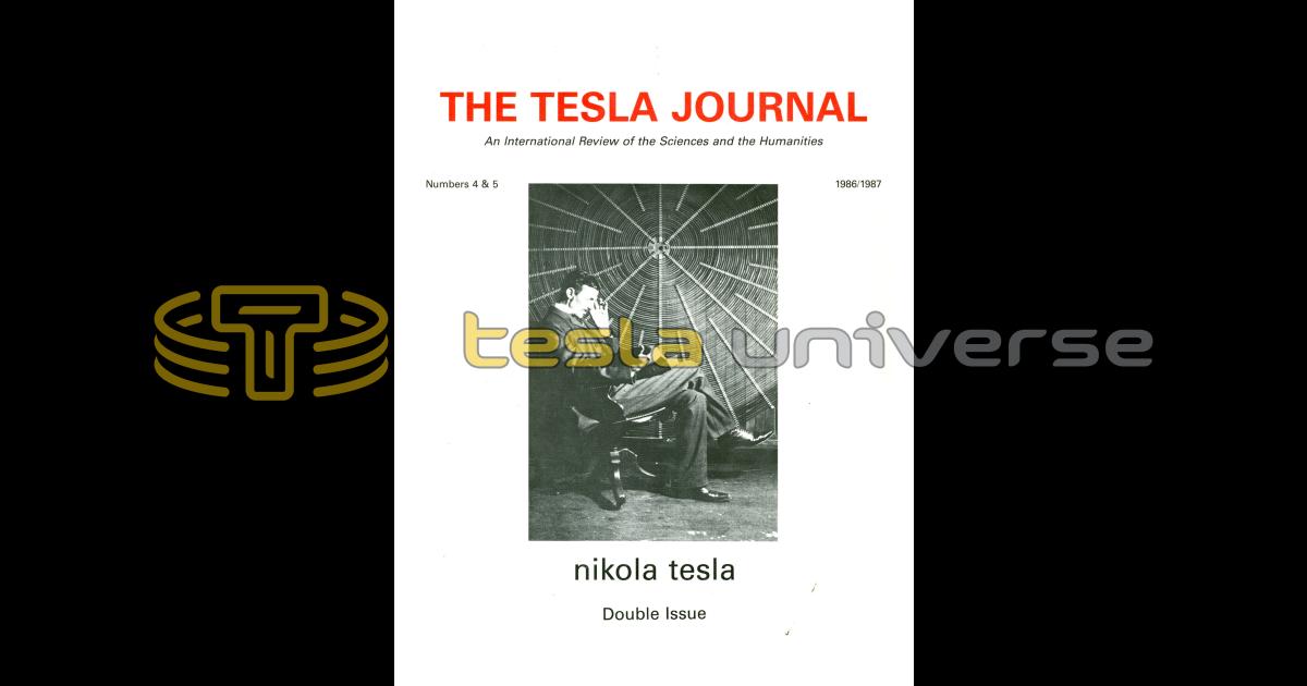 Nikola Tesla Books Books written by or about Nikola Tesla The Tesla Journal - Number 4 & 5 - 1986/1987 Details Category: Biographical Date published: 1986 Publisher: Tesla Memorial Society Format: Softcover Dimensions: 8.5" x 11" Page count: 128 Pagination Enjoy other books First First item Previous Previous item Next Next item Last Last item Within the Universe Documents Nikola Tesla documents, files and papers. Quotes Profound and insightful quotes by Nikola Tesla. Patents Nikola Tesla held around 200 patents worldwide. Timeline Important moments and events related to Tesla. Articles Nikola Tesla in the press. Images Nikola Tesla image and photo library. Landmarks Locations related to Nikola Tesla. Letters Letters to, from and about Nikola Tesla. Movies and TV Nikola Tesla on the screen.