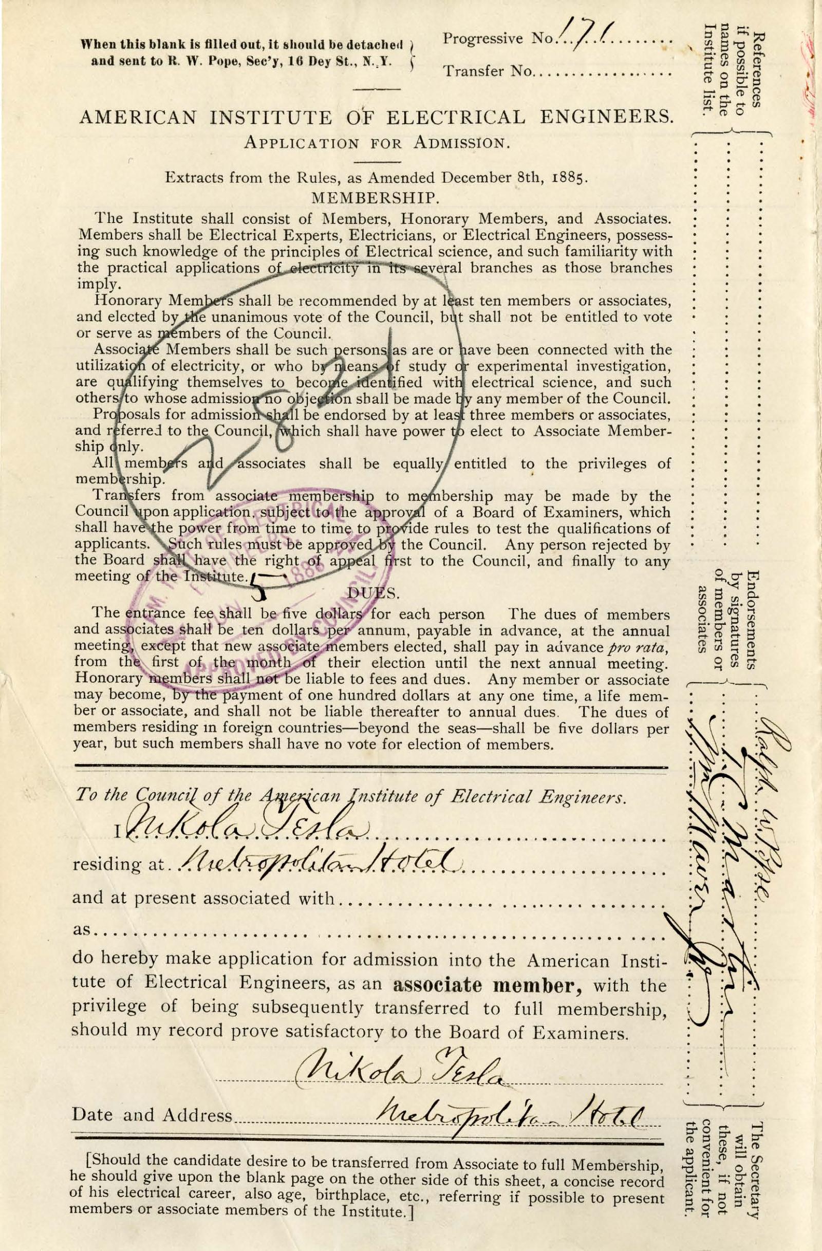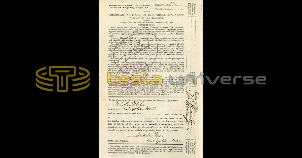 Nikola Tesla Documents Receipts, papers, notes and files related to Nikola Tesla Nikola Tesla AIEE Application for Admission Pagination Enjoy other documents First First item Previous Previous item Next Next item Last Last item Within the Universe Books Books written by and about Nikola Tesla. Quotes Profound and insightful quotes by Nikola Tesla. Patents Nikola Tesla held around 200 patents worldwide. Timeline Important moments and events related to Tesla. Articles Nikola Tesla in the press. Images Nikola Tesla image and photo library. Landmarks Locations related to Nikola Tesla. Letters Letters to, from and about Nikola Tesla. Movies and TV Nikola Tesla on the screen.