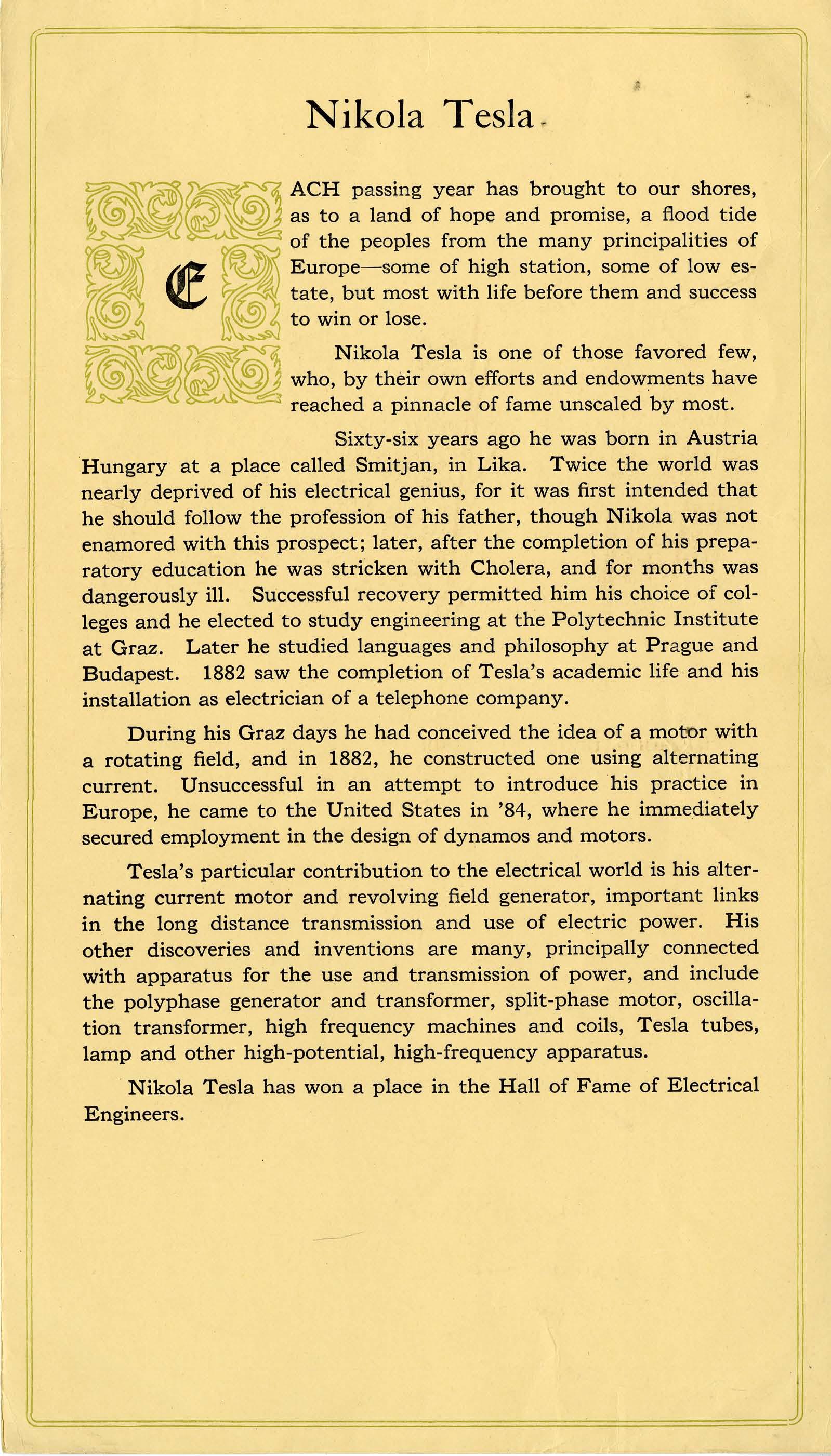 Sixty-six years ago he was born in Austria Hungary at a place called Smiljan, in Lika. Twice the world was nearly deprived of his electrical genius, for it was first intended that he should follow the profession of his father, though Nikola was not enamored with this prospect; later, after the completion of his preparatory education he was stricken with Cholera, and for months was dangerously ill. Successful recovery permitted him his choice of colleges and he elected to study engineering at the Polytechnic Institute at Graz. Later he studied languages and philosophy at Prague and Budapest. 1882 saw the completion of Tesla's academic life and his installation as electrician of a telephone company.