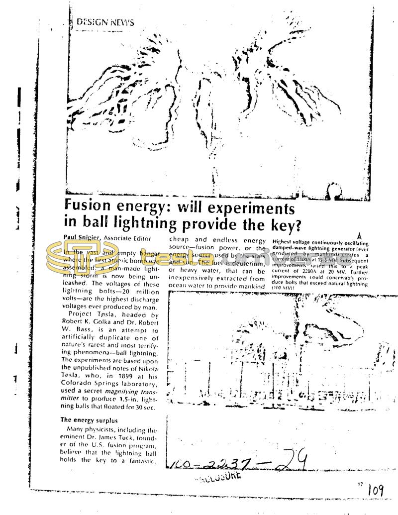 DESIGN NEWS Andr In the vast and empty hangar where the first atomic bomb was assembled, a man-made lightning storm is now being unleashed. The voltages of these lightning bolts-20 million volts are the highest discharge voltages ever produced by man. Project Tesla, headed by Robert K. Golka and Dr. Robert W. Bass, is an attempt to artificially duplicate one of nature's rarest and most terrifying phenomena--ball lightning. The experiments are based upon the unpublished notes of Nikola Tesla, who, in 1899 at his Colorado Springs laboratory, used a secret magnifying transmitter to produce 1.5-in. lightning balls that floated for 30 sec. 3 Fusion energy: will experiments in ball lightning provide the key? Paul Snigier, Associate Editor The energy surplus Many physicists, including the eminent Dr. James Tuck, founder of the U.S. fusion program, believe that the lightning ball holds the key to a fantastic, bing cheap and endless energy source-fusion power, or the energy source used by the stars and sun. The fuel is deuterium, or heavy water, that can be inexpensively extracted from ocean water to provide mankind t a Highest voltage continuously oscillating damped-wave lightning generator lever produced by mankind) creates current of 1100A at 12.5 MV! Subsequent improvements raised this to a peak current of 2200A at 20 MV. Further improvements could conceivably produce bolts that exceed natural lightning (100 MV)! 160-2237HAULUSURE 232-29 ५ Pamovic س سو دس عدد 17 109