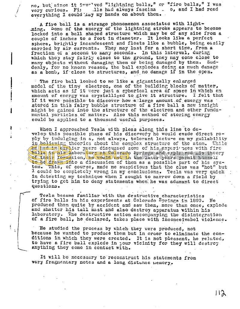 mo, but since it involved "lightning balls, or "fire balls," I was very curious. Fi .lls had always fascina o, and I had read everything I could luy my hands on about them. A fire ball is a strange phenomenon associated with lightning. Some of the energy of the lightning stroke appears to become locked into a ball shaped structure which may be of any size from a couple of inches to a foot in diameter. It looks like a perfect sphore, brightly incandescent and floats like a bubble, being easily carried by air currents. They may last for a short time, from a fraction of a second to many seconds. In this interval, during which they stay fairly close to the ground, they may come close to many objects without damaging them or being damaged by them. denly, for no known reason, the ball explodes doing as much damage as a bomb, if close to structures, and no damage if in the open. SudThe fire ball looked to me like a gigantically enlarged model of the tiny electron, one of the building blocks of matter, which acts as if it were just a spherical area of space in which an amount of energy was crystallized to give it structure. I felt that if it were possible to discover how a large amount of energy wes stored in this fairy bubble structure of a fire ball a new insight might be gained into the structure of the electron and other fundamental particles of matter. Also this method of storing energy could be applied to a thousand useful purposes. When I approached Tesla with pleas along this line to develop this possible phase of his discovery he would evade direct roply by indulging in a, not always, tolerant lecture on my gullability in believing theories about the complex structure of the atom. While he had in earlier years discussed some of his experi'nces with fire balls in his laboratory at Colorado Springs and explained is theory of their formation, he would not in the later years permit himself to be drawn into a discussion of them as a possible part of his systom. This, of course, made me suspicious that the clue was "hot" but I could be completely wrong in my conclusions. Tecla was very quick: in detecting my technique when I sought to narrow down a field by trying to get him to deny statements when he was adamant to direct questions. Tesla became familiar with the destructive characteristics of fire balls in his experiments at Colorado Springs in 1899. Be produced them quite by accident and saw them, more than once, explode and shatter his tall mast and also destroy apparatus within his laboratory. The destructive action accompanying the disintegration of a fire ball, he declared, takes place with inconceivabel violence. He studied the process by which they were produced, not because he wanted to produce them but in order to eliminate the conditions in which they were created. It is not pleasant, he related, to have a fire ball explcde in your vicinity for they will destrog anything they come in contact with. It will be necessary to reconstruct his statements from vory fragmentary notes and a long distance Lemory. 112