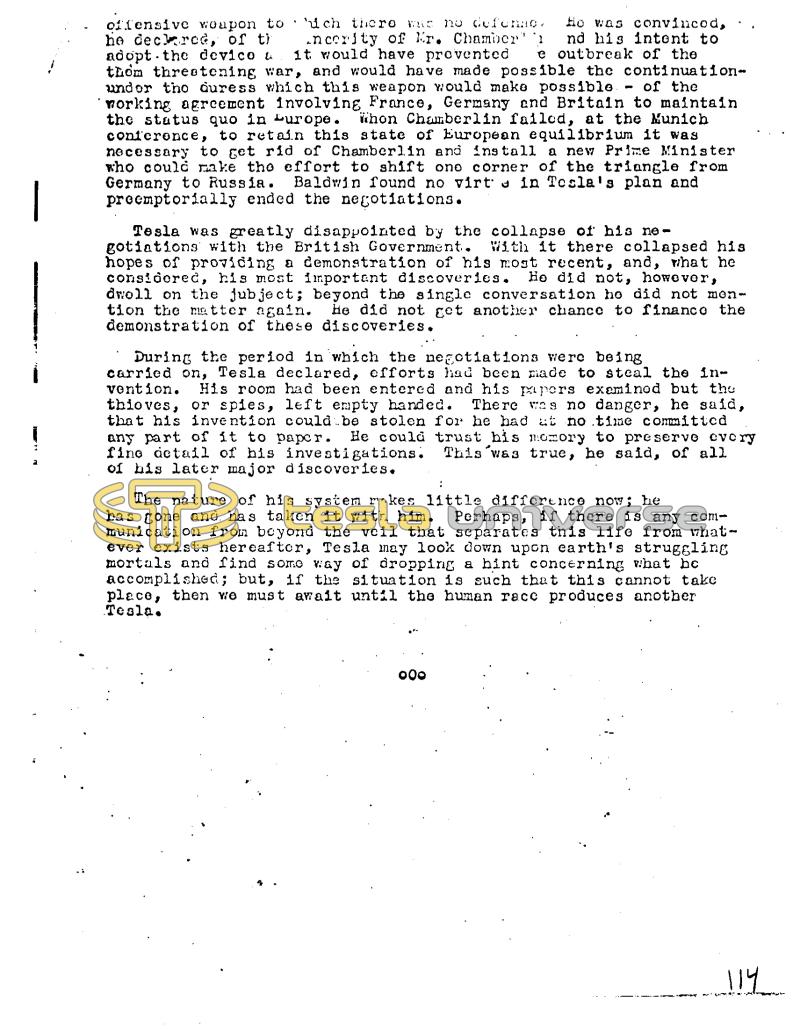 2 Į offensive weapon to ich there was no defenac. He was convincod, he decree, of th ncerity of Kr. Chamber'i nd his intent to adopt the devico u it would have prevented e outbreak of the thom threatening war, and would have made possible the continuationund or tho duress which this weapon would make possible of the working agreement involving France, Germany and Britain to maintain the status quo in Europe. Thon Chamberlin failed, at the Munich conference, to retain this state of European equilibrium it was necessary to get rid of Chamberlin and install a new Prime Minister who could make the effort to shift one corner of the triangle from Germany to Russia. Baldwin found no virt in Tesla's plan and preemptorially ended the negotiations. - Tesla was greatly disappointed by the collapse of his negotiations with the British Government. With it there collapsed his hopes of providing a demonstration of his most recent, and, what he considered, his most important discoveries. He did not, however, dwoll on the jubject; beyond the single conversation ho did not mention the matter again. he did not get another chance to financo the demonstration of these discoveries. During the period in which the negotiations were being carried on, Tesla declared, efforts had been made to steal the invention. His room had been entered and his papers examinod but the thioves, or spies, left empty handed. There was no danger, he said, that his invention could be stolen for he had at no time committed any part of it to paper. He could trust his momory to preserve every fine detail of his investigations. This was true, he said, of all of his later major discoveries. The nature of his system makes little difference now; he has gone and has taken it with him. Perhaps, if there is any communication from beyond the veil that separates this life from whatever exists hereafter, Tesla may look down upon earth's struggling mortals and find some way of dropping a hint concerning what he accomplished; but, if the situation is such that this cannot take place, then we must await until the human race produces another Tesla. 000 114