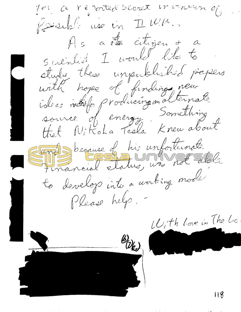 for a reported secret V Possible As a đ a quentist. I would like to styles these unpublished papers with hope of findings is as in thifor producing an alternate Something new am source of energy that Nikola Tesla Knew about invenison of use in II UW... aut citizen and because of his unfortunate Financial status, was not able to develop into a working mode Please help. - BOW With Love in The Lo 118