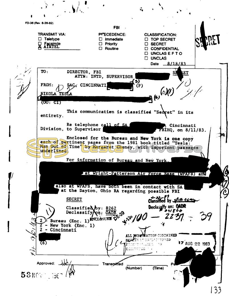 1 1 I FD-36 (Rev. 8-26-82) z TRANSMIT VIA: Teletype Facsimile AIRTEL 10X TO: FROM: D NIKOLA TESLA (00: CI) entirety. FBI PRECEDENCE: Immediate DIRECTOR, FBI Approved: □ Priority Routine ATTN: INTD, SUPERVISOR 53 NOV 198 SAC CINCINNATI + Re telephone call of SA Division, to Supervisor is, foto) This communication is classified "secret" in its Bureau (Enc. 1) ENCLOSURE New York (Enc. 1) Cincinnati Classified by: 8262 Declassify on: OADR (P) Enclosed for the Bureau and New York is one copy each of pertinent pages from the 1981 book titled "Tesla: Man Out of Time" by Margaret Cheney, with important passages underlined. For information of Bureau and New York. DE-39 CLASSIFICATION: TOP SECRET □ SECRET 00 V-13% Transmitted also at WPAFB, have both been in contact with SA at the Dayton, Ohio RA regarding possible FBI SECRET paypa CONFIDENTIAL UNCLAS E FTO UNCLAS Date 8/18/83 "at Wright-Patterson Air Force Base (WPAFB) and $100 SE RET ... (Number) Cincinnati FBIHQ, on 8/11/83. پریشن SECRET ALL INFORMATION CONTAINED HERETH 1 URTEATRIED (Time) Classified by Georg seva Declassify on: QADR 291860 2237 - 39 Pe 17 AUG 22 1983 133